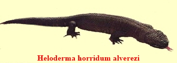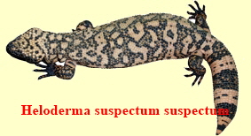 Heloderma suspectum cinctum lives in northwest Arizona, southeast Calfornien, south Nevada, southwest Utah. Heloderma suspectum suspectum lives in south Arizona, southeast New Mexiko and northwest Mexiko. They lives only in dry, stoney desert areas. They live offen close to dry up washes or riverbeds where in the rainy seasons (July and August) the water runs trough. The dig holes or dens or make there homes under rock out croppings.Heloderma horridum horridum, Heloderma horridum alvarezi and Heloderma horridum exasperatum habitats are in the dry forest areas of western mexiko. They Make there homes in rocky, and or bush covered aeras near dry riverbeds. The dig there burrows in the rockier ground or amang the roots of trees or large bushes. In the more wooded aeras they will climb in the branches, ypu won’t notice them execpt when you come to clase. Then they will make a loud hissing sound. Especially in the rainy seasons you can find the larger Heloderma horridum horridum in the branches above the ground.Heloderma horridum charlsbogerti live only in the tropical drywoodland aeras in Guatemalas and is the least know off all the under speices. The Heloderma suspectum will grow up to 65 cm and appear to be plump, the tail looks swollen, Round and Short with a round stubby end. The Heloderma horridum horidum will grow up to 90 cm they have a long round tail, and appear to have a thinner body.Both Lizards have wide flat heads, an round bodys, they have short strong legs and small eye and ear openings. The skin has a beadwork like appearance made up of invidual rounded, raised scales. Inside the scales are small boney plates. There is exensive variations in the skin coloring, a more or less reticulated pattern of black and brown light yellow to red colorations depending on the invidual lizards on the tail is from 4 to 7 stripes. Skin Claws Heloderma horridum alverezi is almost all one dark color. Where as all the other have the light an dark colorations. The Helodermas are night active and live in burrows. In Arizona (USA) the Heloderma suspectum have been observed though out the whole year (According to the temperature) To be Active close to there holes. The males will travel farther away in April to mid may in search of a Partner, from July - August the lizards will be found hunting. In extreme hot summers they stay in there holes and live off the fat reserves in the tails.The Heloderm eat, bird eggs, young birds, rats, mouse, and also dead animals. It has also been reported that will eat liveing or dead Reptiles and there eggs. |